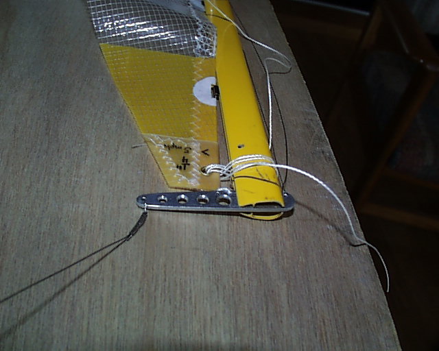 The line hinge provides the same function but is thought to be less restrictive, particularly in light air. It is easy to do. This hinge is installed when the mainsail is installed on the mast. The idea is to make a figure 8 routing of 80# Spectra or 30# Spiderwire. The confluence of the two loops are, of course, the hinge and should not be tight. Here you see the first effort in such a hinge. Two wraps should be all that is needed instead of the three shown. Finish this with a square knot away from the hinge.