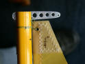 Fixed or Line Hinge Two Methods Headboard Fixed Hinge Installation Slide the hinge up the mast with the tapered part of the tab down. Mark the mast 5/8" below the top. Align the top of the hinge to that mark. Drill a hole, with the #55 bit, through the hinge wood adapter but not through the other side of the mast. Pin the hinge in place with a cut down 18 gauge escutcheon. This alignment will allow clearance for the sail headboard beneath the mast crane.