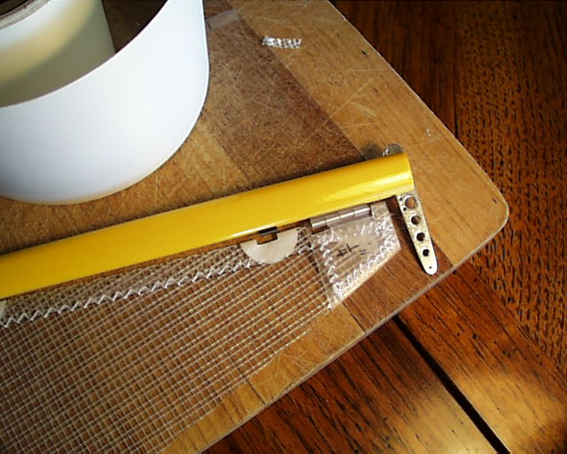 Then use the razor knife to slice the threads inside the headboard so the hinge tab will slide inside between the heavy material. You may need to trim the tab of the hinge to fit. This is okay. When you have a nice fit trim away the threads and put the sail away until you are ready to install it.