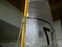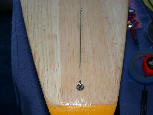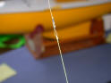Install the backstay bowsie about 2/3rds the distance down from the wire loop. Loop the line through the hook and back to the bowsie. Make sure the mast is reasonably straight. Take up the slack but do not tighten. It will bring down the rig and you will have to start all over again. You may have anyway. Ain't this fun? Tie the line coming from the hook to the bowsie with three half hitches.