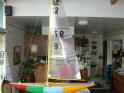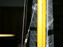Wind gusts can cause the sail to fill over powering the backstay tension and lifting the aft end of the boom. This will cause the topping lift line to go slack with a good chance of snagging in the upper rigging. A bungee is installed in this line on the boom to take up this slack.