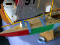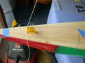 A Jib Jig You might like to make this wooden jig for installing the jib assembly to the rig. Installing the jib by yourself is almost like trying to eat a soup sandwich; everything is going somewhere at the same time. A block was prepared to fit between the jib rack and the fairlead and stand exactly 2" off the deck. Ours, shown here, is notched so the varied boom designs that we have tried will lay flat on the jig and level with the deck. The block is taped to the deck and the boom to the block. It will hold the boom solid while you put pressure on the jibstay and crimp it at the mount on the boom. Likewise, for the sizing of the uphaul and the installation of the topping lift. "Build it, you will like it."