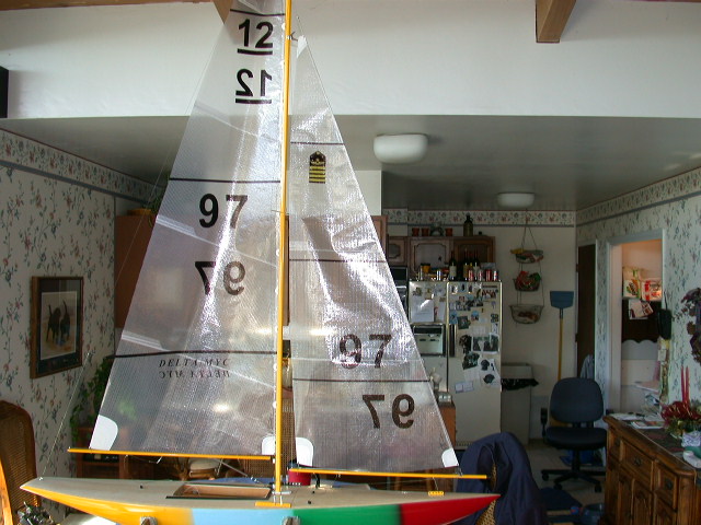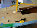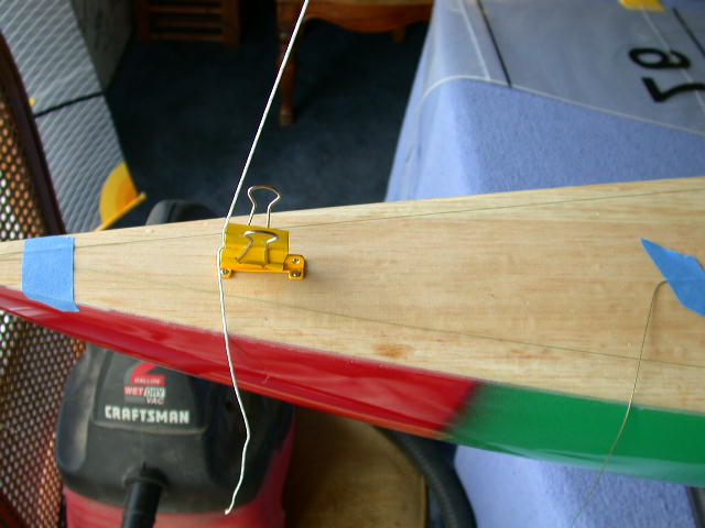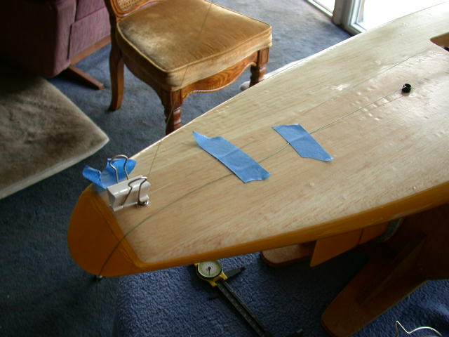 Standing the Mast, "HELP!" Stand the rig in the center hole of the mast step. Place the upper shrouds through the #5 hole in the racks. Place the temporary jibstay line through the forward hole of the jib rack. Place the backstay through the deck mount. Now, trying to hold the mast reasonable straight, clip all four with paper binding clamps so they will hold the rig upright. "Oooh, nasty...I could hear that all the way over here!"
