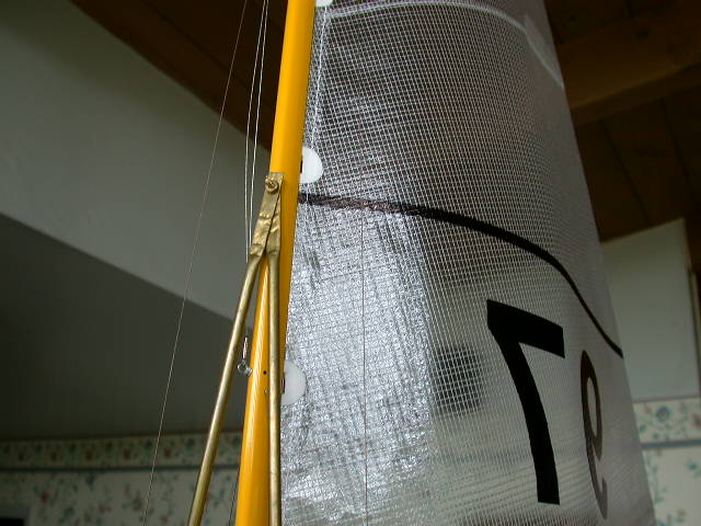 Preparations Install the backstay in the small hole at the rear of the crane with a swage. Make a small swaged loop at the other end about 60" from the top of the mast. Tie a 24" piece of line to the loop with a small Bowline knot. Make up a heavier line with some sort of hook for the crane that will reach to the jib rack. This will be a temporary forestay. Install the forestay standoff. This is a 2-1/4" piece of 80# Spectra or 30# Spiderwire line with a small Bowline loop and tied to the forestay mount with three half hitches. Install a medium CL connector to the line loop. This connector will be the collector for the jib forestay wire, the jib uphaul and is to provide clearance for the topping lift over the jumper spreaders. Install the jib boom to the sail. Attach the clew to the boom with a travel loop as was done with the mainsail to its boom. Tie the line on the tack to the forestay mount on the boom. This will be about 3/4" off the boom.