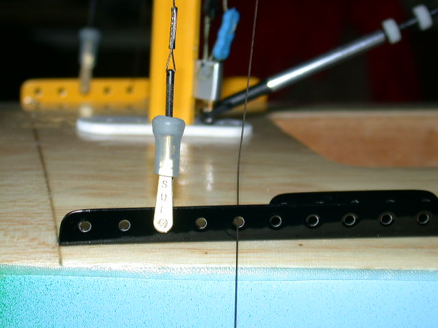 Make up six shroud tension connectors. You will use four here. First install the connectors for the lower shrouds in the the #3 hole of the racks. This will be the same as installing a wire loop but the rigging coupler will be added to the inside. Leave the loop big and loose and gently tug the end of the wire till the mast is centered on the divider. Slide the swage down tight and crimp it. Think during this process and make sure that the shroud wires are free of any tangles or crossings. Now, unclamp the uppers and install their connectors in the same manner and clip them into the #5 hole. Remove the divider when you are done.