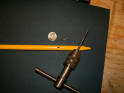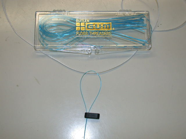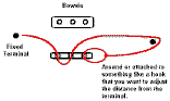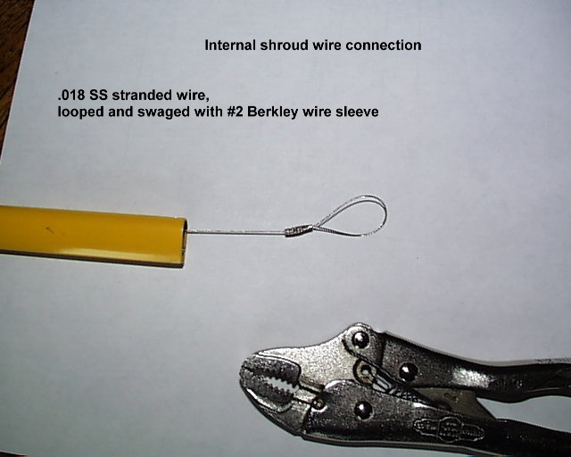 The Bowsie Adjuster The bowsie is a non-mechanical "Come-Along" winch. If you are dyslexic like our shop hangout Vern, the diagram below might help. When Vern and us got together there were few pictures. Then one day came a drawing deep in The Manual For The East Coast 12-Meter manual. "Ah-ha! That's how the blasted thing works." There will be many uses for this device. Some of the smaller bowsies are difficult to thread with heavier Dacron line like the boom travel bowsie setup. Floss threaders will help you out and are useful in other applications where a closed loop is workable. They can be found in dental drug sections of major outlets. Internal Tang Termination .018 Stainless Steel rigging wire is passed through a #2 Berkley wire sleeve connector (swage) and then back into the swage again forming a small loop. This is then crimped with 5" Visegrip pliers in the center of the swage so the ends are not crushed. 1/3 of this is then cut away. Generally, the #2 swage will hold with a single wire, however, here is a good place to add some mass. These are used for connecters in the rigging or for terminating at a mounting point. .018 Stainless Steel rigging wire is passed through a #2 Berkley wire sleeve connector (swage) and then back into the swage again forming a small loop. This is then crimped with 5" Visegrip pliers in the center of the swage so the ends are not crushed. Trim off the excess wire with cutters. If you are terminating at a mount, begin with a very large loop so that you can tug on the excess end to firm the working portion of the wire around the mount. While holding this firm, slide the swage down to close the loop at the mount. While still holding the excess end firmly, crimp the swage. Now that the wire will hold in place, re-crimp if need be and cut off the excess end.