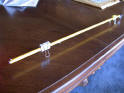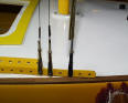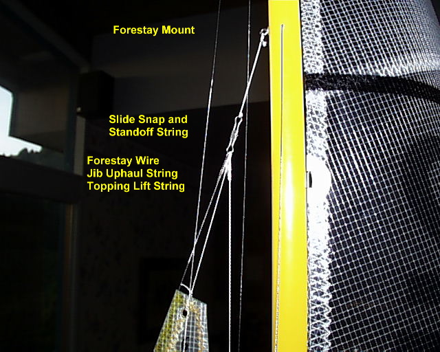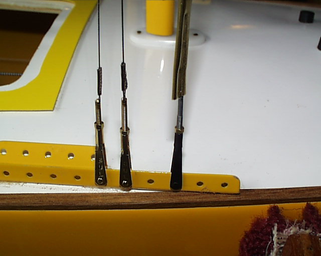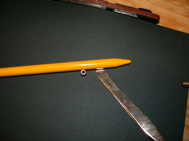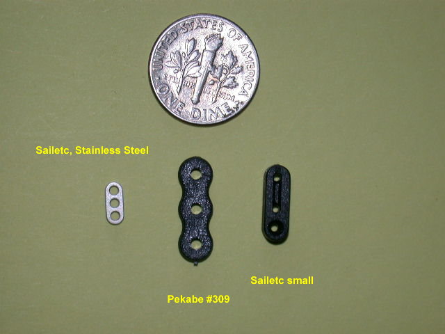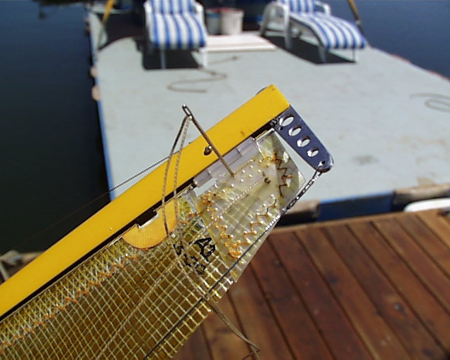 The Great Basin #140 eye bolt is shorter with 3.5mm threads. It is generally used only for the sheetline guides as it has the larger eyelet. #144 eye bolt is the longer one with 3.0mm threads. This piece has lower wind drag and is used for mounts and control line guides. A hole is drilled with a #44 bit and then threaded with a 3.0mm or 3.5mm tap as needed. A bit of epoxy resin is placed in the hole. Thread the bolt into the hole and then place a bit more glue on the threads of the bolt. Finish the threading for the orientation on the mast or boom that is wanted. Do not over tighten so as to strip the threads in the metal. This was allowed to cure with the eye downward so the resin would flow toward the eye on the inside of the boom.