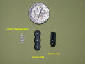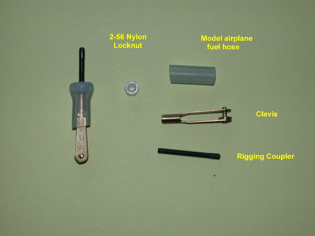 The connectors are assembled from the parts shown. The lock nut is a Nylon 2-56 stock item from Small Parts. Any model airplane fuel hose is used to prevent the clevis from loosening or disappearing in your sail case. The clevis is by Sullivan and can be found at Tower Hobbies. The rigging coupler is a Du-Bro #201. Thread the lock nut onto the coupler with the flange toward the clevis. Place it so the shaft of the coupler just reaches the inside hilt of the clevis. Install the hose on the clevis and then thread in the coupler with the lock nut attached. Push the hose up over the lock nut.