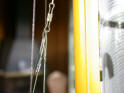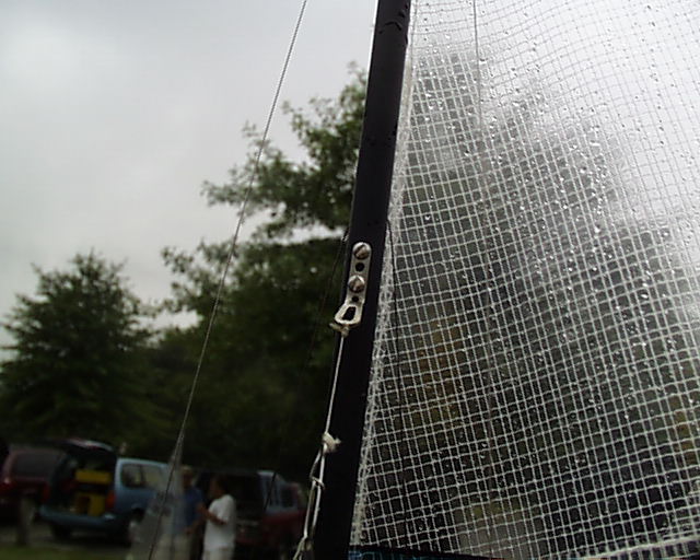 If you have not prepared the sail, you need to do that before you start here. Slide the sail hanks into the track on the mast. They will get a bit unruly as the jackline is not secure and will loosen during the process. It is best to do this on a table. The line headboard hinge is installed now. If you are using the fixed hinge, just slide the hinge board into the headboard of the sail. You can put a paper binding clip on it or tape it to the crane to hold it in place.