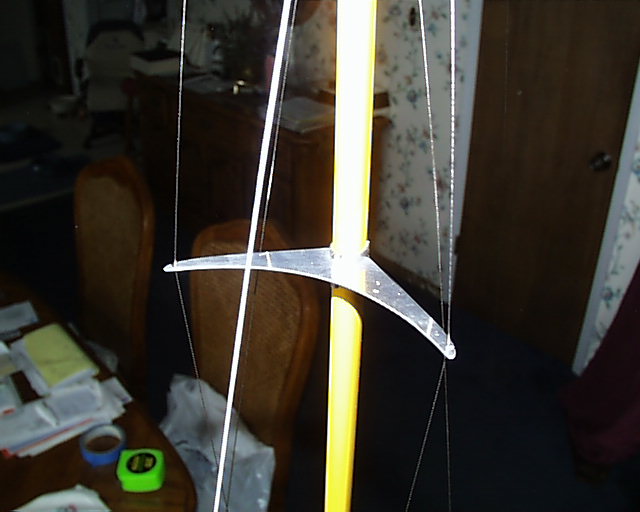To pre-tension the jumper wires, the mast was then laid, leading edge facing up, over two 1/8" dowels at both attach points and taped to the bench at the jumpers. This created a reverse bend to the mast. The ends of the jumper wires were then snuggled up, the swage moved down to the mounting eyelet and crimped. When finished, there should be an ever so slight forward bend to the mast, sometimes none but the tension is there. The eyelet mount process took about 20 minutes including the set up for the pre-bend.