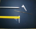 The spreaders have been selected at 33-1/8" from the base of the mast. Place some blue tape on both sides and mark where to drill. Drill the holes with a #51 bit. This is not as easy as it sounds. The small bit has a tendency to "walk" inside the mast before it grabs and penetrates the other side. This will leave you with an askew spreader. Insert the bit deep into the drill chuck so that the bit remaining is just enough to reach through both sides of the mast. If you can clamp or hold the mast flat on a piece of wood, it will help. When you go through the near side, take care to hold the drill in alignment and don't put a lot of pressure against the other wall. Going through should be a surprise. Test this on the piece of mast you have cut off till you have the touch.